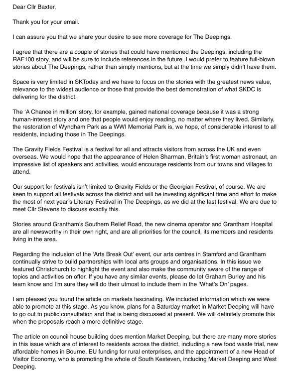 The response spends a lot of time defending the stories about Grantham and argues that perhaps they are relevant to residents of the Deepings. If that’s the case, I would argue that the main reason they are relevant is that Deepings residents help to pay for Grantham activities in one way or another. That would be fine if the Deepings was not ignored… but it is!