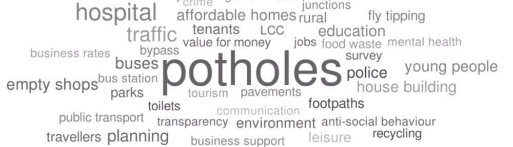A further question asks what respondents to identify what is important to them. This has been used to generate one of those funny ‘word cloud’ thingies which illustrates the disdain people hold for many of the services for which Lincolnshire County Council is mostly responsible including potholes, road repairs and street lights. This supports my ongoing argument that the failings of the County Council have a negative impact on the District Council.