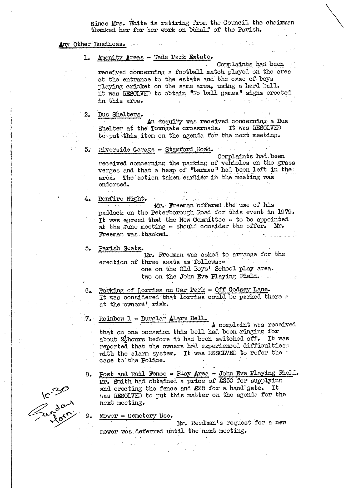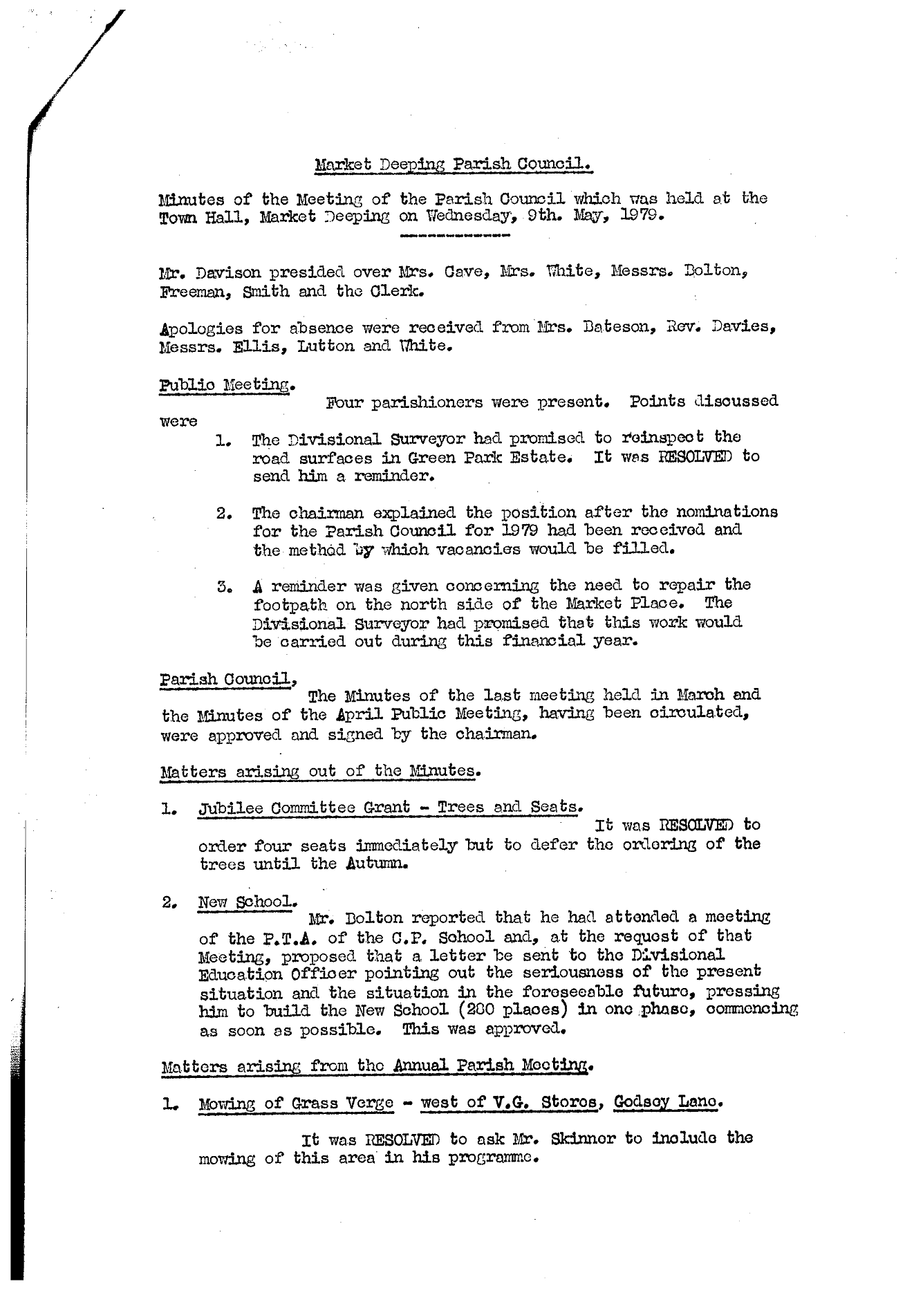 I was recently given some ancient papers by a generous benefactor which include the minutes of the Market Deeping Parish Council (as it was then known) from exactly 40 years ago this month (May 1979).